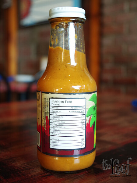 Ingredients: red peppers, habanero peppers, tomato, onion, garlic, ginger, carrot, vinegar, cilantro, molasses, brown sugar, pineapple, raisins and water.